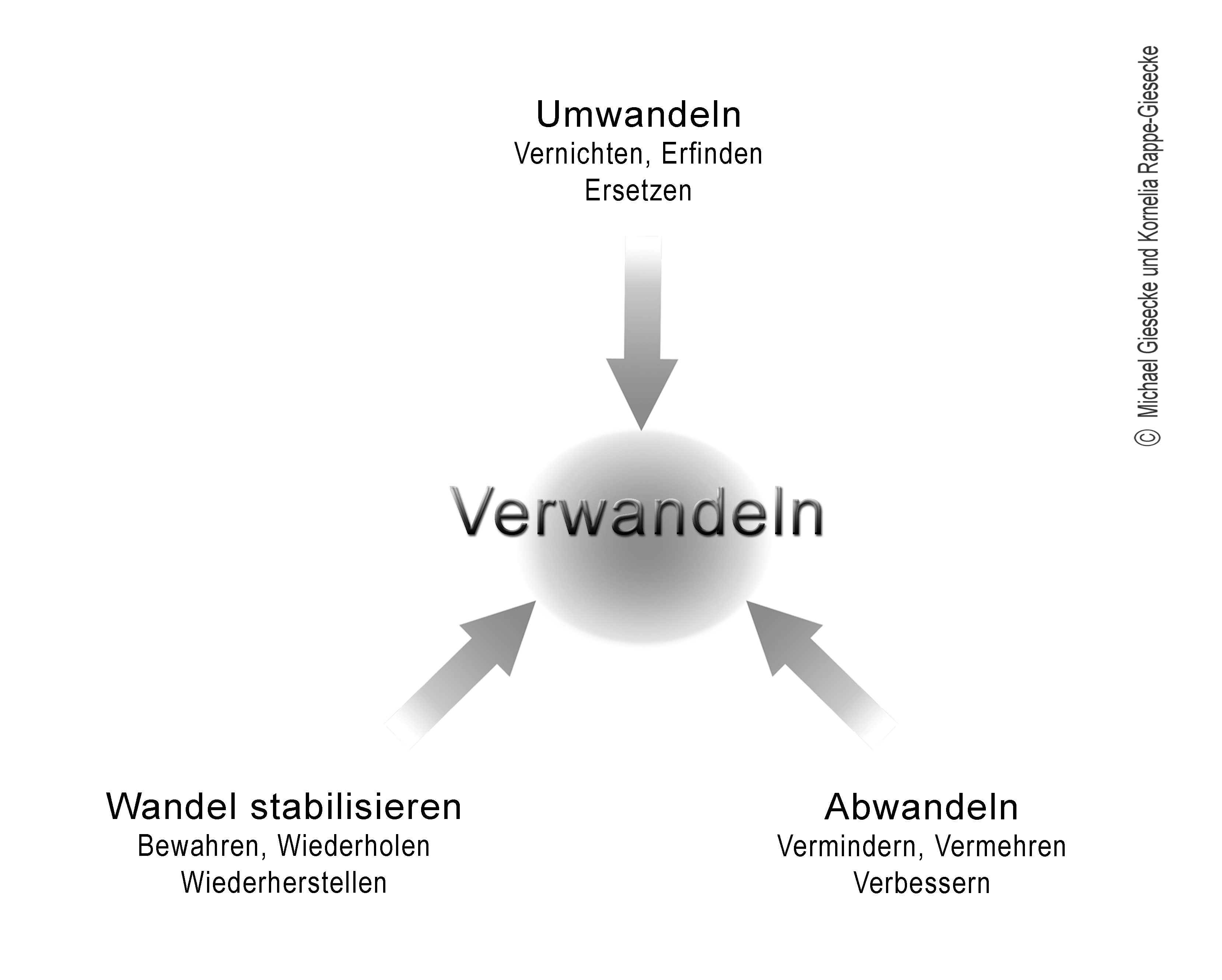 Die Triade der bewussten, sinngetriebenen und zielgerichteten Transformation benennt den disruptiven, revolutionären Prozess des Vernichtens und Ersetzens Umwandeln, den kontinuierlichen Prozess des Reformierens durch Vermindern und Vermehren Abwandeln und den stabilisierenden Prozess des Bewahrens durch Wiederholen Wandel stabilisieren.